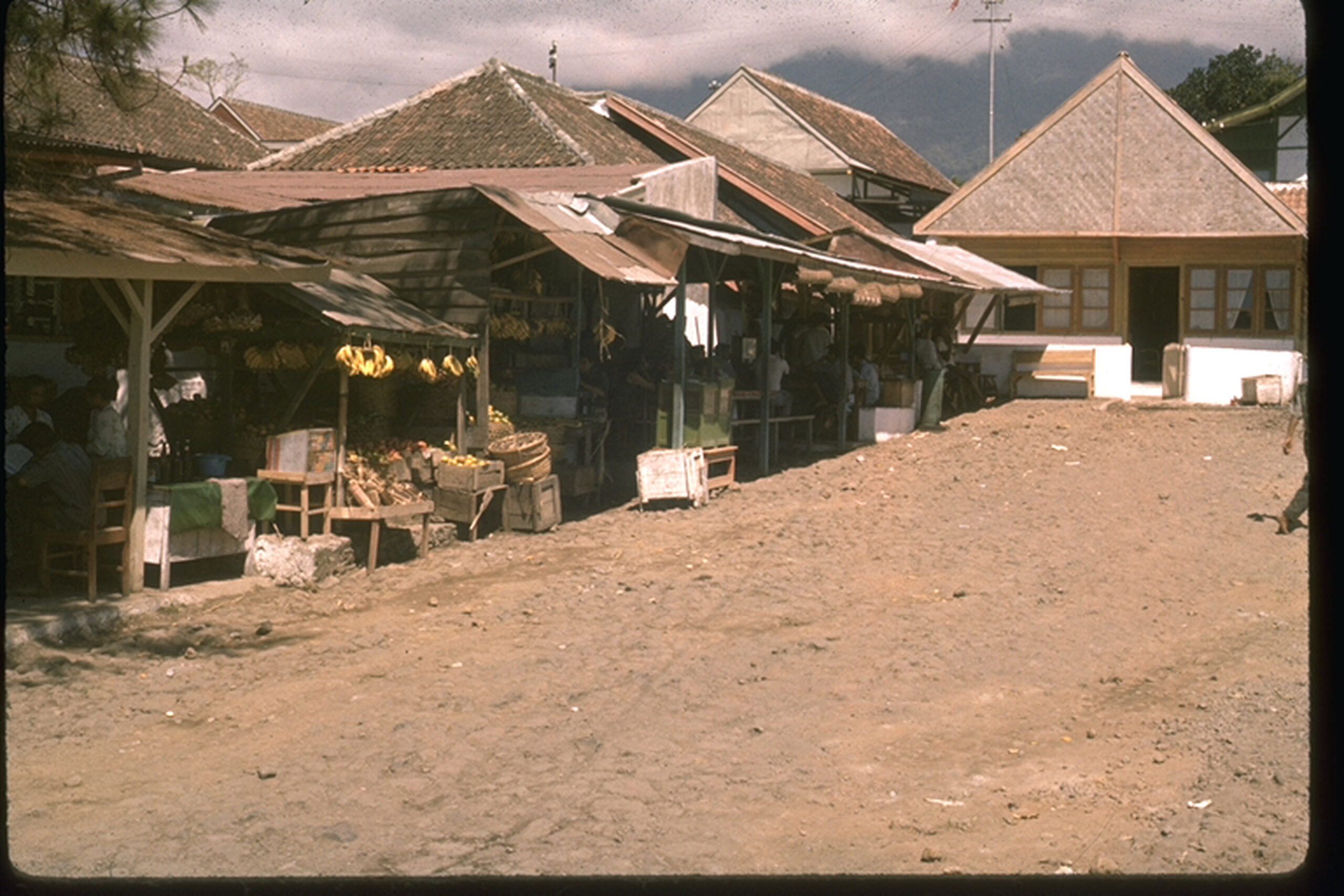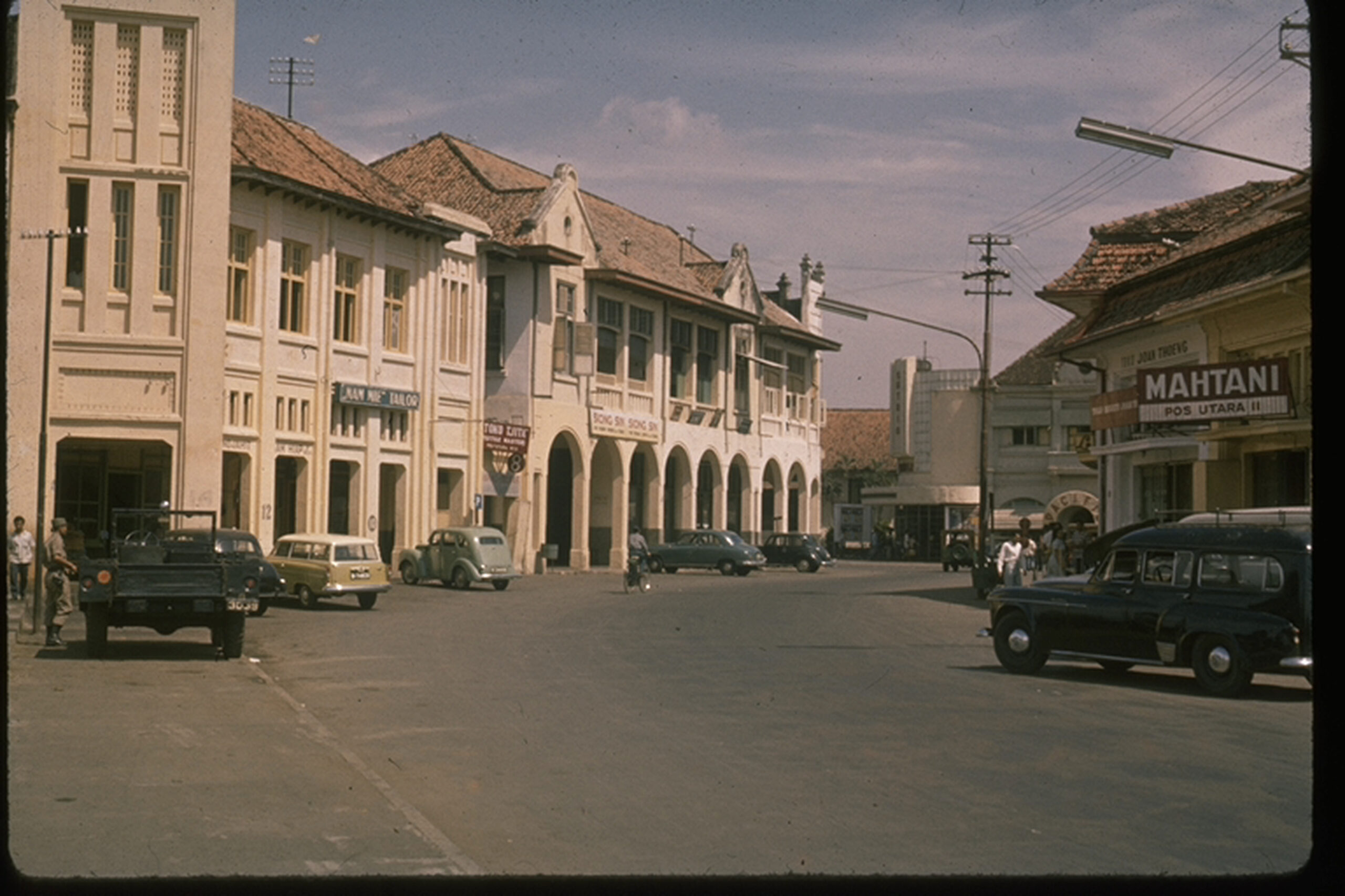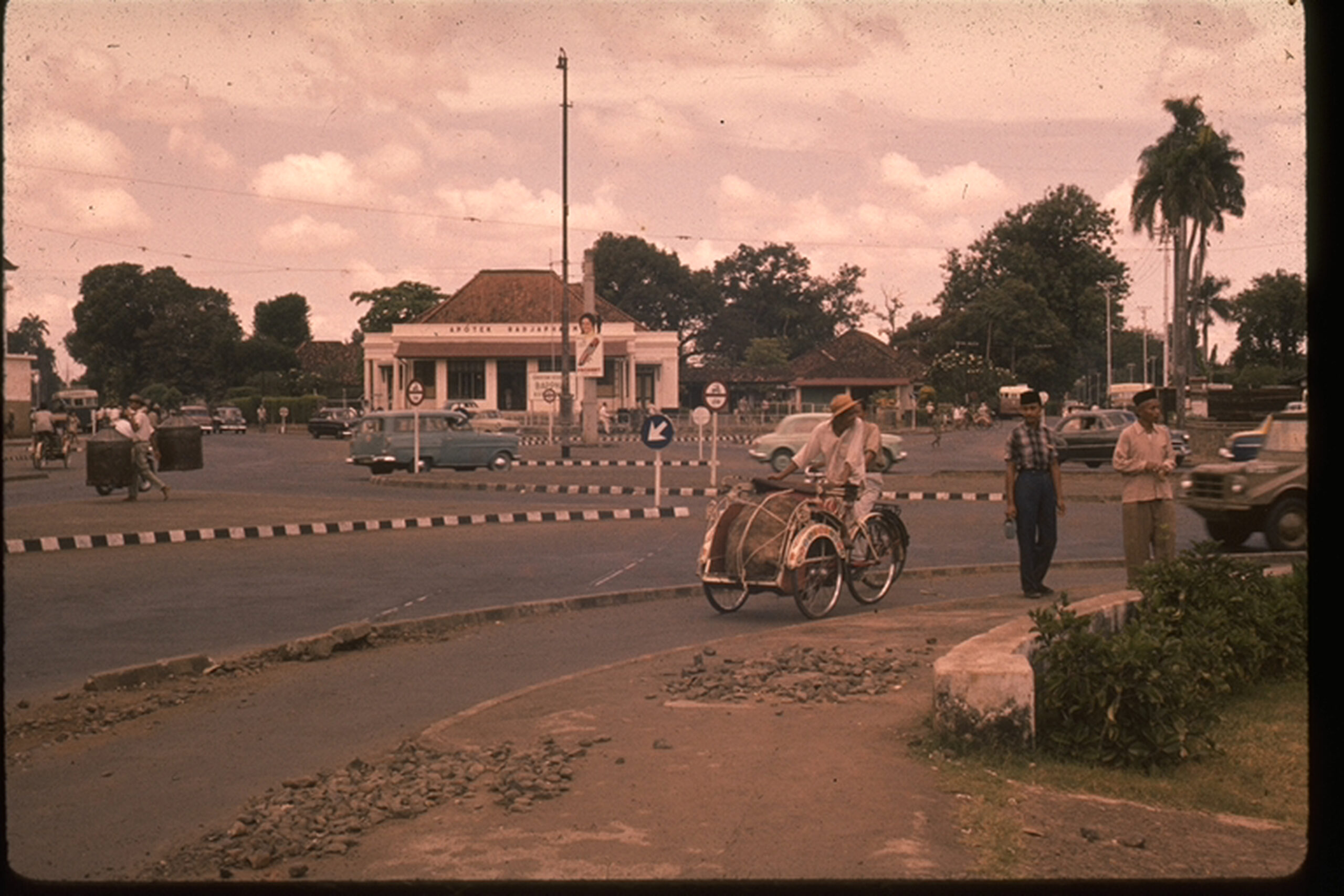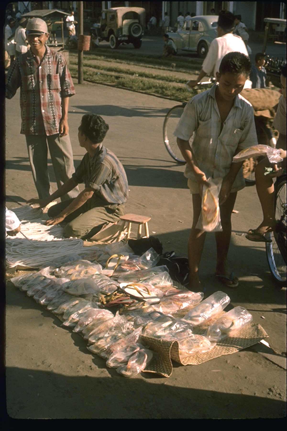 Boeb also did some street photography in Jakarta (I think it is): scenes full of traffic, the Monday Market (‘Pasar Senen’),2 a kali (river). There is a guy who is traversing the muddy water. At a street corner a woman is selling food: ketupat, tempeh, ikan, maybe lontong.